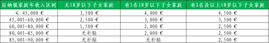 补贴申请门槛为家庭年应税收入不超过8万欧元,需提供往年纳税证明作为凭证。
