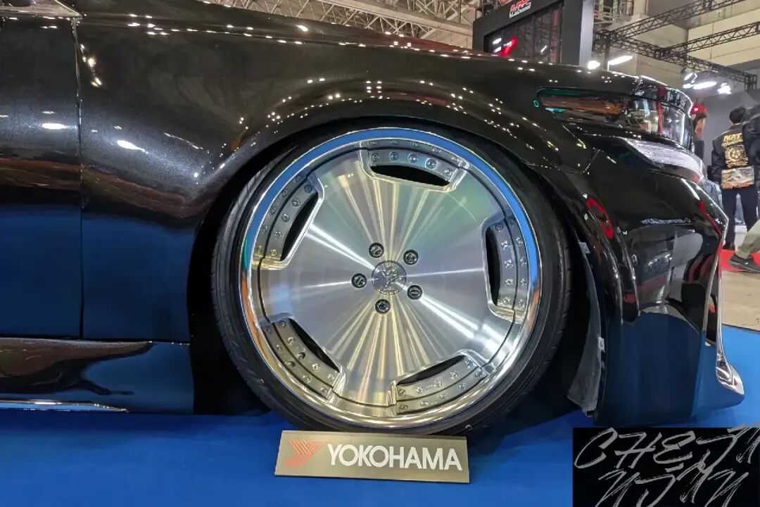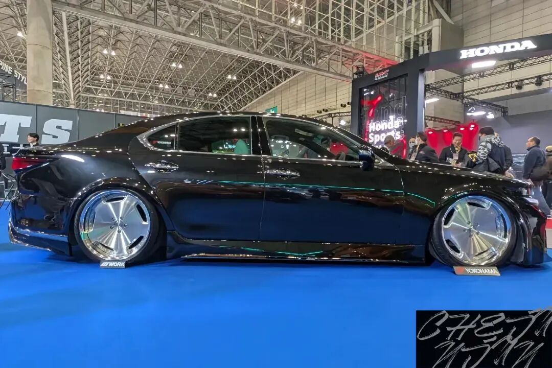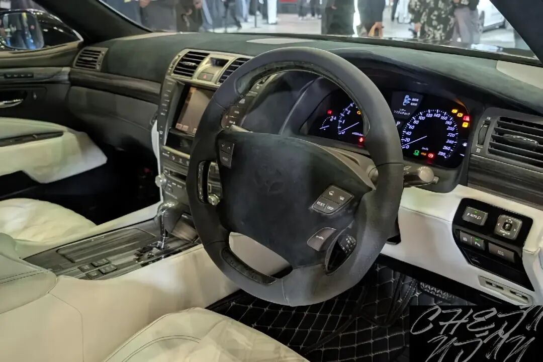 车侧轮廓基本保留了LS460的流畅线条,但前后叶子板被刻意加宽,搭配更深邃的侧裙设计,让原本修长的豪华房车多了几分MPV的厚实感。21寸WORK抛光铝圈与气压悬挂系统的组合,更将车身高度大幅降低,呈现贴地巡航的低趴姿态,为这辆“MPV风轿车” 注入浓烈的改装气质。