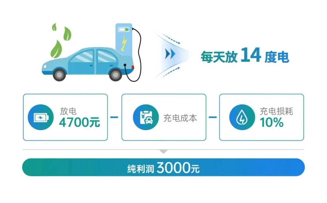 假设居民用户每天放电14千瓦时,考虑一定出行裕量,全年按300天计算,放电收入可达约4700元,扣除充电成本和保守估计的10%充放电电量损耗,纯收益可达近3000元。