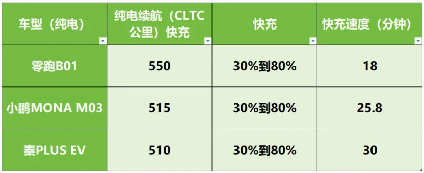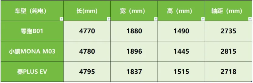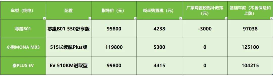 下面我就拿三款现在热度挺高的10万级纯电轿车来比比看:零跑B01、小鹏MONA M03、比亚迪秦PLUS EV。咱们就拿它们各自中间档的续航版本来算。