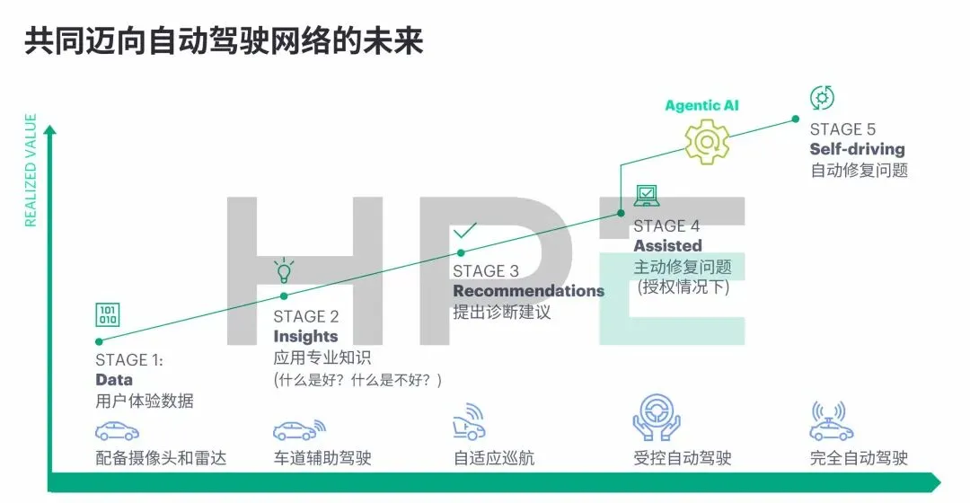 HPE Networking将自动驾驶网络的发展与汽车自动驾驶的分级进行类比,清晰勾勒出其演进路线。