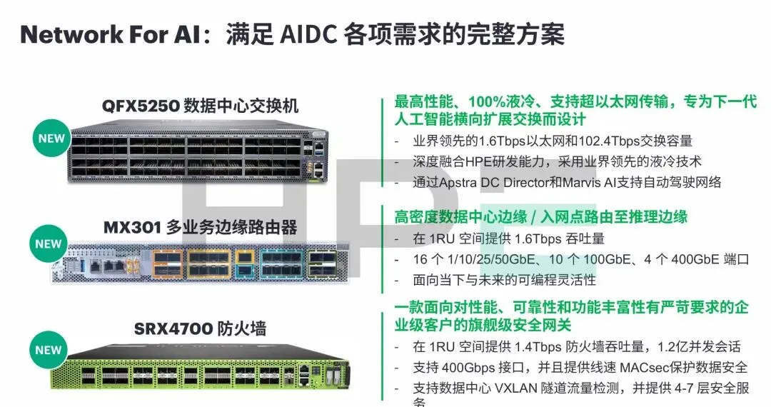 在Networks for AI方面,HPE Networking发布了三款重磅硬件产品,以满足AI时代对高带宽、低时延、高可靠性的网络需求。HPE Juniper Networking QFX5250交换机搭载博通Tomahawk 6芯片,具备102.4Tbps带宽,并支持高密度1.6T以太网端口,能够满足AI数据中心GPU集群互联的超高带宽需求。紧凑型的HPE Juniper Networking MX301多服务边缘路由器提供高达1.6Tbps的性能和 400G连接能力,能够让AI推理更靠近数据生成源,适用于推理、多业务、城域网、移动回传及企业路由环境等多种业务场景。HPE Juniper Networking SRX4700 防火墙在1U空间内可提供1.4Tbps防火墙吞吐量和1.2亿并发会话数,支持400G 以太网端口并提供线速MACsec加密保护,为AI数据中心提供了高效可靠的安全防护。