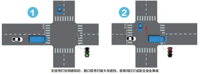 比如由于前方大车遮挡,自动驾驶车辆无法识别前方的交通参与者、信号灯或者交通运行状况。