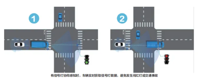 路侧系统通过多源信号灯数据感知融合,获取准确的路口信号灯实时数据,并通过V2X 发送给周围车辆,收到此信息的车辆可根据信号灯相位和倒计时信息,提前做出驾驶决策控制,有无车路协同信号灯感知识别的比较。