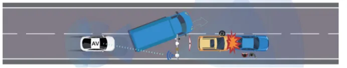 前方事故,AV 主车跟驰时前车突然避让。由于前车处置突然,对于跟驰的后车来说,前车前方的区域在后车的盲区里,使得后车无法提前发现前方有事故,来不及反应,导致出现二次交通事故。