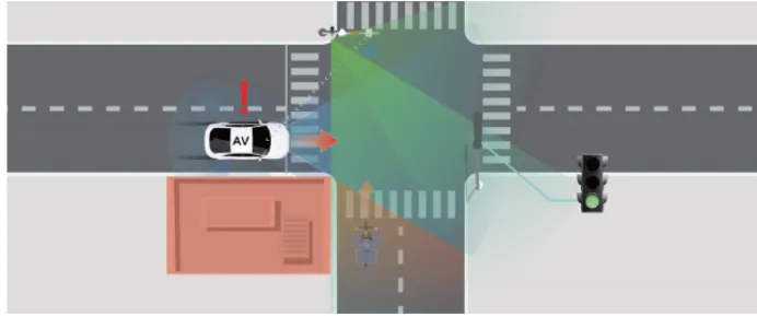 自动驾驶车辆在绿灯通过路口时,车辆感知被旁边固定物体(建筑物等)所遮挡,此时若垂直方向非机动车违规行驶闯红灯,因自动驾驶车辆按照交规正常行驶,须以正常速度及时通过路口,无法预见盲区会出现违规驾驶的非机动车,导致出现交通事故。