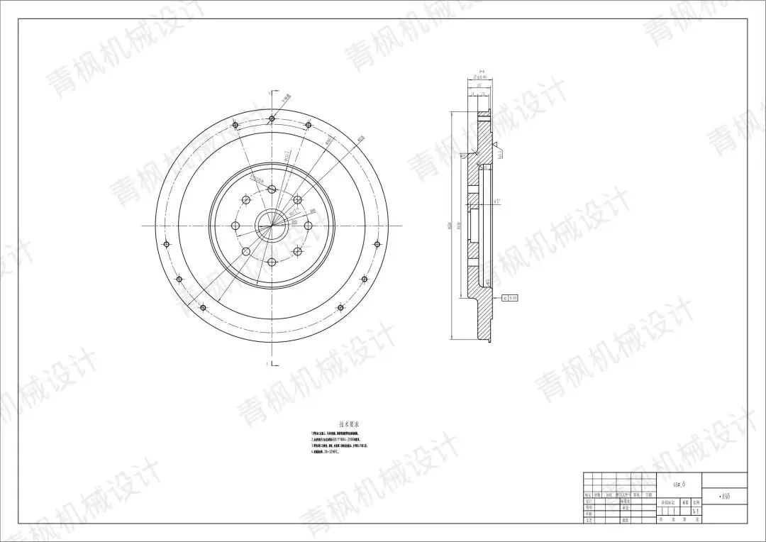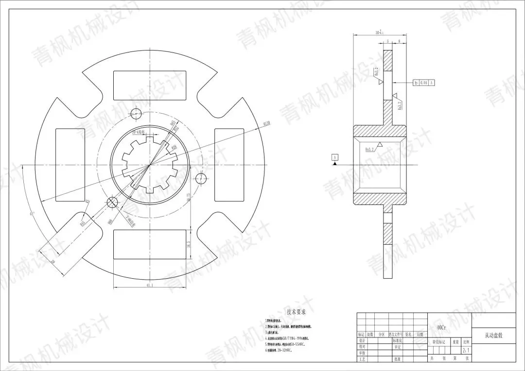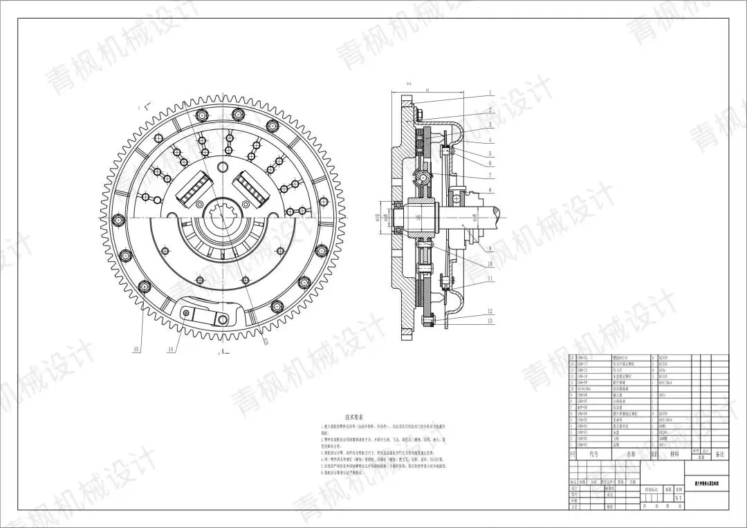 最后,完成了压盘与离合器盖的结构设计。压盘采用灰铸铁HT200,质量约3kg,并通过温升校核验证其散热性能;离合器盖采用08钢板冲压,保证刚度与对中性。