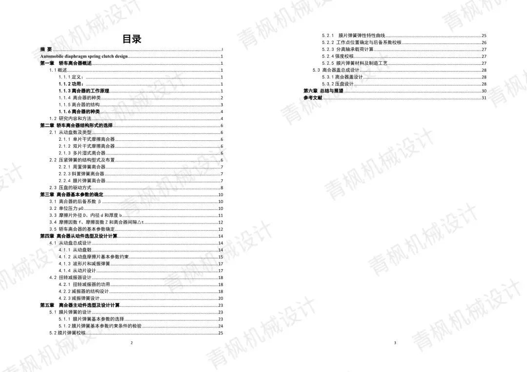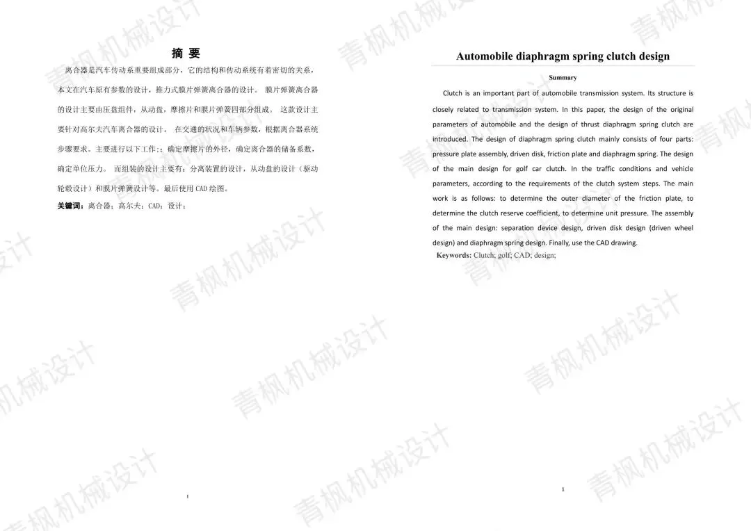 本论文针对高尔夫汽车,系统设计了一款推力式膜片弹簧离合器。设计围绕离合器在传动系统中的核心功能展开,主要包括基本参数确定、从动盘总成设计、膜片弹簧设计与校核以及压盘设计等关键环节。