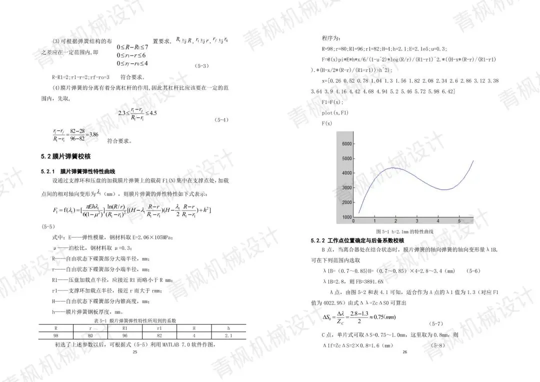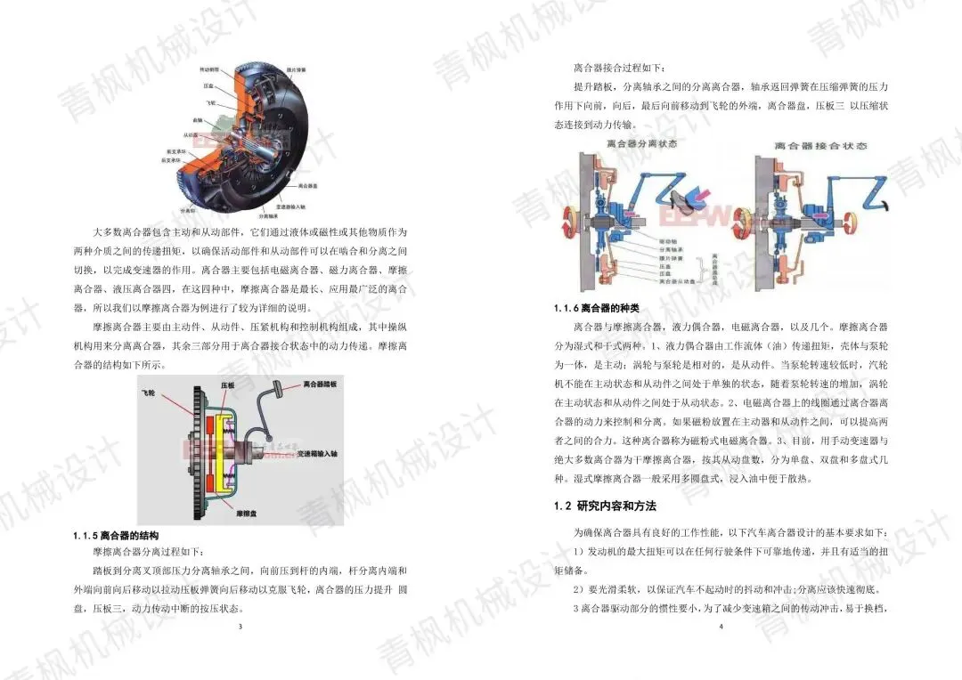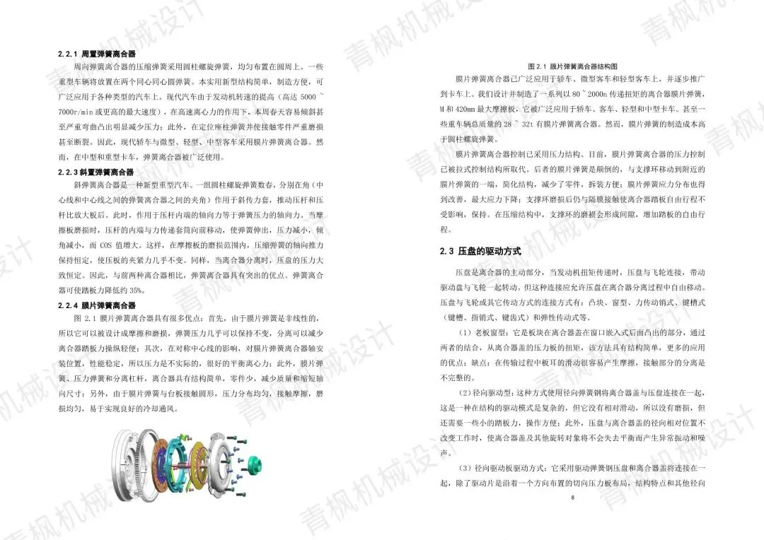 核心部分为膜片弹簧设计。论文选取H/h=1.8、h=2.1mm等关键参数,通过弹性特性曲线分析,确定了接合、磨损极限和分离状态下的工作点,并进行了应力校核,确保其满足强度要求。膜片弹簧采用推式结构,具有压紧力稳定、操纵轻便、结构紧凑等优点。