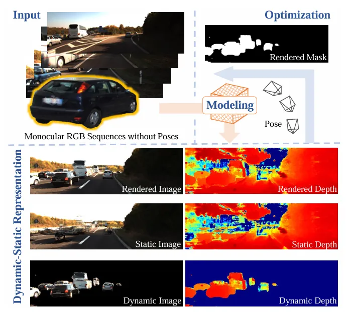 彻底告别位姿依赖:针对自动驾驶场景,打破了对多传感器(如LiDAR)或预计算位姿的依赖。仅凭单目RGB图像序列,即可在无位姿输入的情况下实现高质量的动态场景重建。