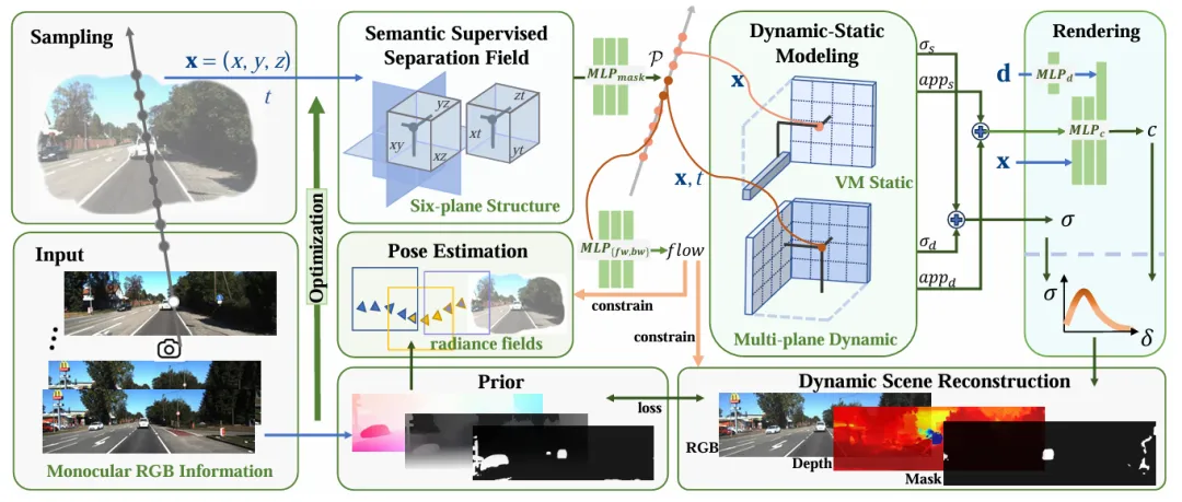 采样级语义解耦(Sampling-Level Decoupling):不同于传统方法在渲染后期进行混合,该方法在射线采样的早期阶段引入语义监督分离场。它为每个采样点分配“动态”或“静态”概率,直接将它们送入独立的模型进行处理,从源头上杜绝了动静特征的混淆。