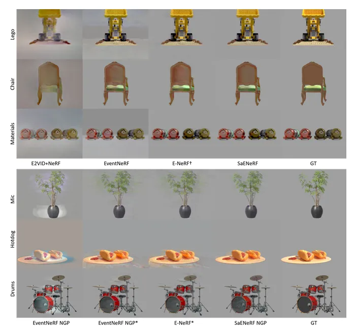 画质飞跃:在合成与真实数据集的对比中,SaENERF 重建的背景几乎没有噪点,物体的几何边缘也更加清晰,视觉保真度远超 EventNeRF 和 E-NeRF。