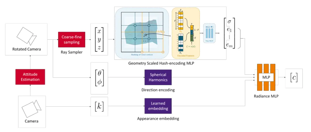 图5:太空目标联合重建架构。 针对无姿态的非合作目标,模型引入了姿态估计模块(左侧红色模块),并结合梯度缩放的哈希编码,在单一太阳光源下同步优化卫星的几何结构与运动参数梯度缩放哈希编码 (Gradient-Scaled Hash Encoding):为了防止优化过程陷入局部极小值(Local Minima),设计了一种训练调度策略。在初期屏蔽高频特征的梯度,让姿态估计器先在低频空间“找准方向”,再逐步丰富细节。
