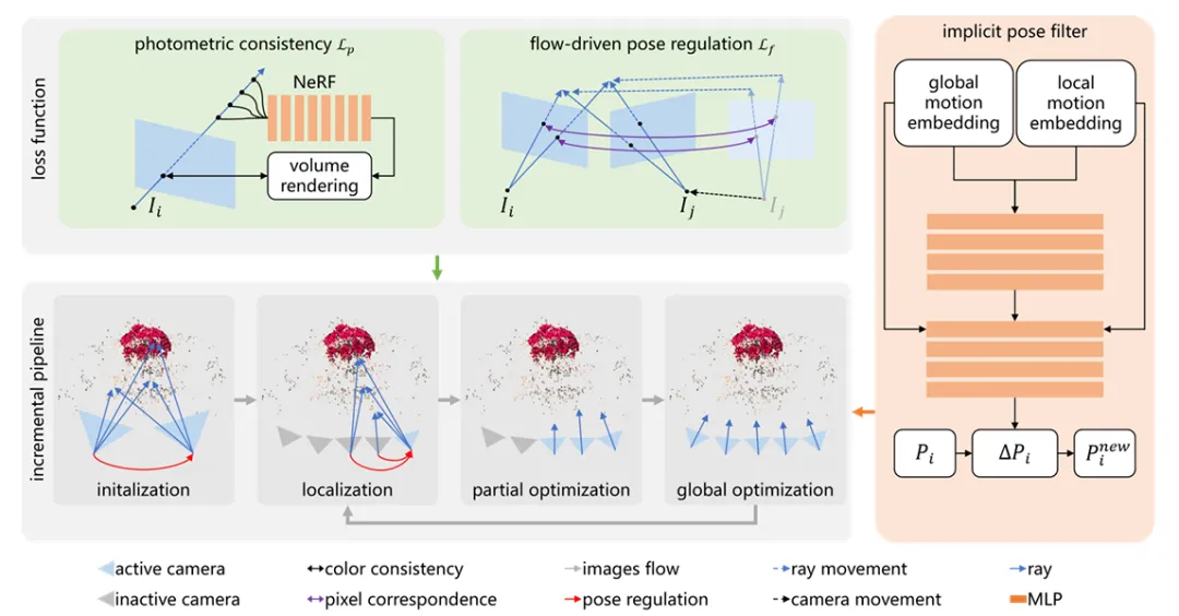 图7:RA-NeRF 增量式重建流程。 为了解决复杂轨迹下的局部极小值问题,系统引入了流驱动的位姿调节(上方中间)以及隐式位姿滤波器(右侧),通过平滑梯度噪声来实现精准定位。隐式位姿滤波器 (Implicit Pose Filter):作者没有直接优化位姿参数,而是训练了一个 MLP 网络作为滤波器。它接收全局和局部的运动嵌入(Embedding),输出平滑的位姿更新量,有效过滤了优化过程中的梯度噪声。