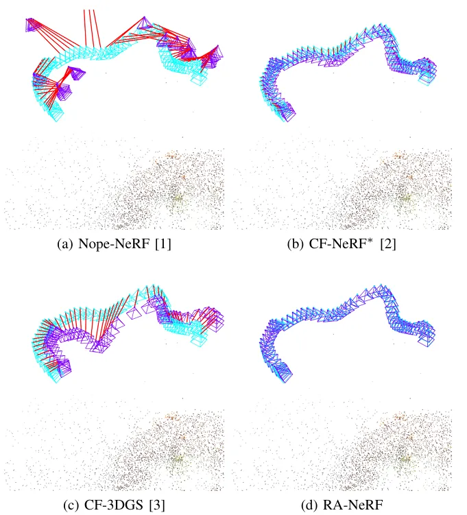 图8:NeRFBuster 数据集上的轨迹估计对比。 在包含大幅度旋转的复杂场景中,RA-NeRF(图d)估计的相机轨迹(蓝色锥体)与真值最为贴合,而 Nope-NeRF 等基线方法(图a-c)出现了严重的轨迹漂移(红色连线表示误差)。跨越理想与现实的鸿沟:构建全天候的 3D 感知能力