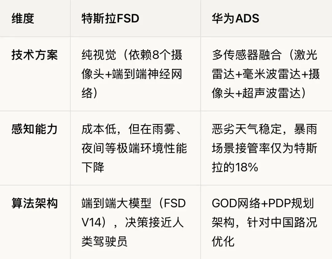 两者技术路线不同,但都在推动自动驾驶向更高等级发展。特斯拉的端到端大模型代表行业趋势,华为的多传感器融合在当前中国路况下更实用。随着技术演进,未来两者可能会在“轻硬件+强AI”方向上趋同。