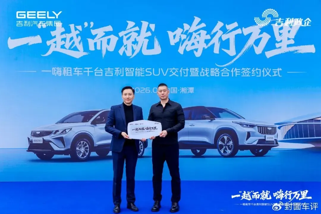 2026年1月18日,吉利湘潭基地,一排排崭新的全新博越与缤越SUV整齐列队。随着吉利汽车、一嗨租车以及永赢金租三方领导共同开启战略合作仪式,1000台吉利智能SUV正式交付一嗨租车投入运营。