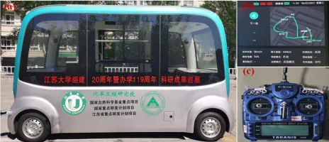 图1 CADVs: (a)江苏大学CADVs一侧;(b) CADVs路线图;(c)用于接管CADV的遥控器。
