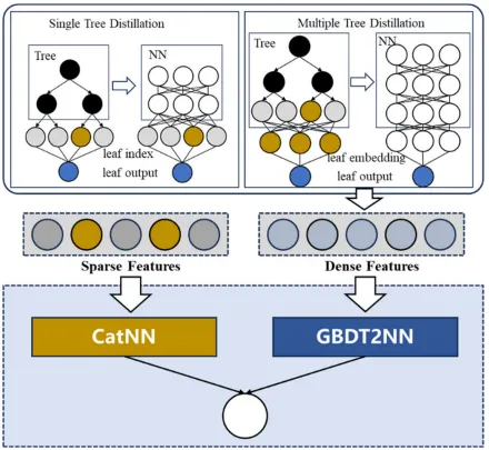 DeepGBM 模型:融合 GBDT 与神经网络,分为 CatNN(处理稀疏分类特征,通过嵌入层 + FM + 深度学习捕捉特征交互)和 GBDT2NN(提取 GBDT 知识,通过叶节点嵌入、树结构蒸馏优化密集数值特征处理)。超参数:树数量 100,学习率 0.1,最大叶节点数 64,批次大小 256。DeepGBM 模型框架如图 3 所示。