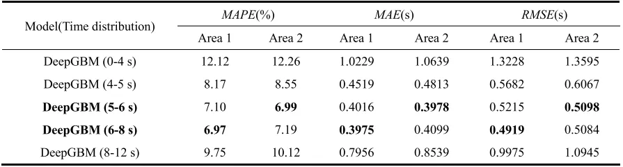不同模型的评价结果统计如图 4 所示,不同接管时期 DeepGBM 接管时间预测性能对比如图 5 所示。虽然 Transformer 的 MAPE 略低于 DeepGBM,但其整体性能稍差。DeepGBM 对中等时长(5-8s) 接管时间的预测效果最优,短时长(0-4s)和长时长(8-12s)预测误差较大。