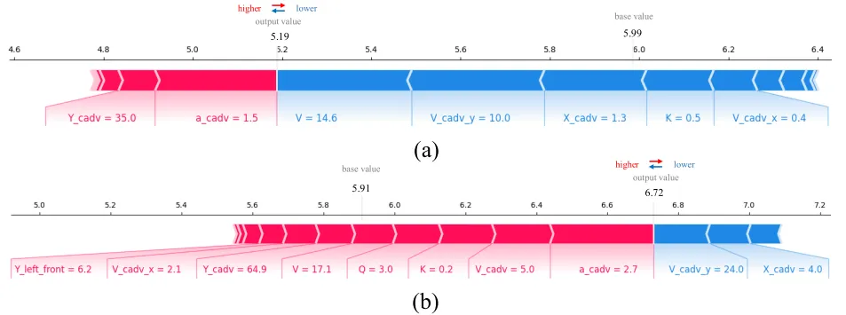 为每个流量变量分配一个 SHAP 值,如颜色条的长度所示,以指示其对接管时间预测的贡献。色条越长,该交通流变量对预测概率的贡献就越显著。红色变量(如 a_cadv=2.7m/s²)正向提升接管时间,蓝色变量(如 V_cadv_y=24.0m/s)反向降低接管时间,所有变量共同作用形成最终预测值。