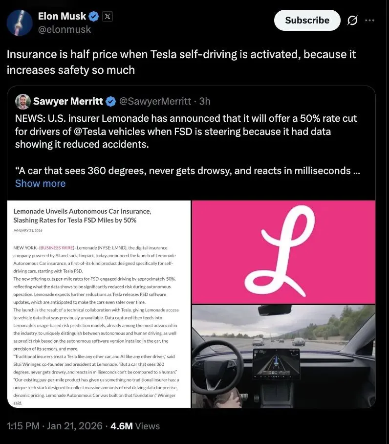 最近,Lemonade 保险公司宣布:只要你的特斯拉开启了 FSD 模式,保费直接打五折。