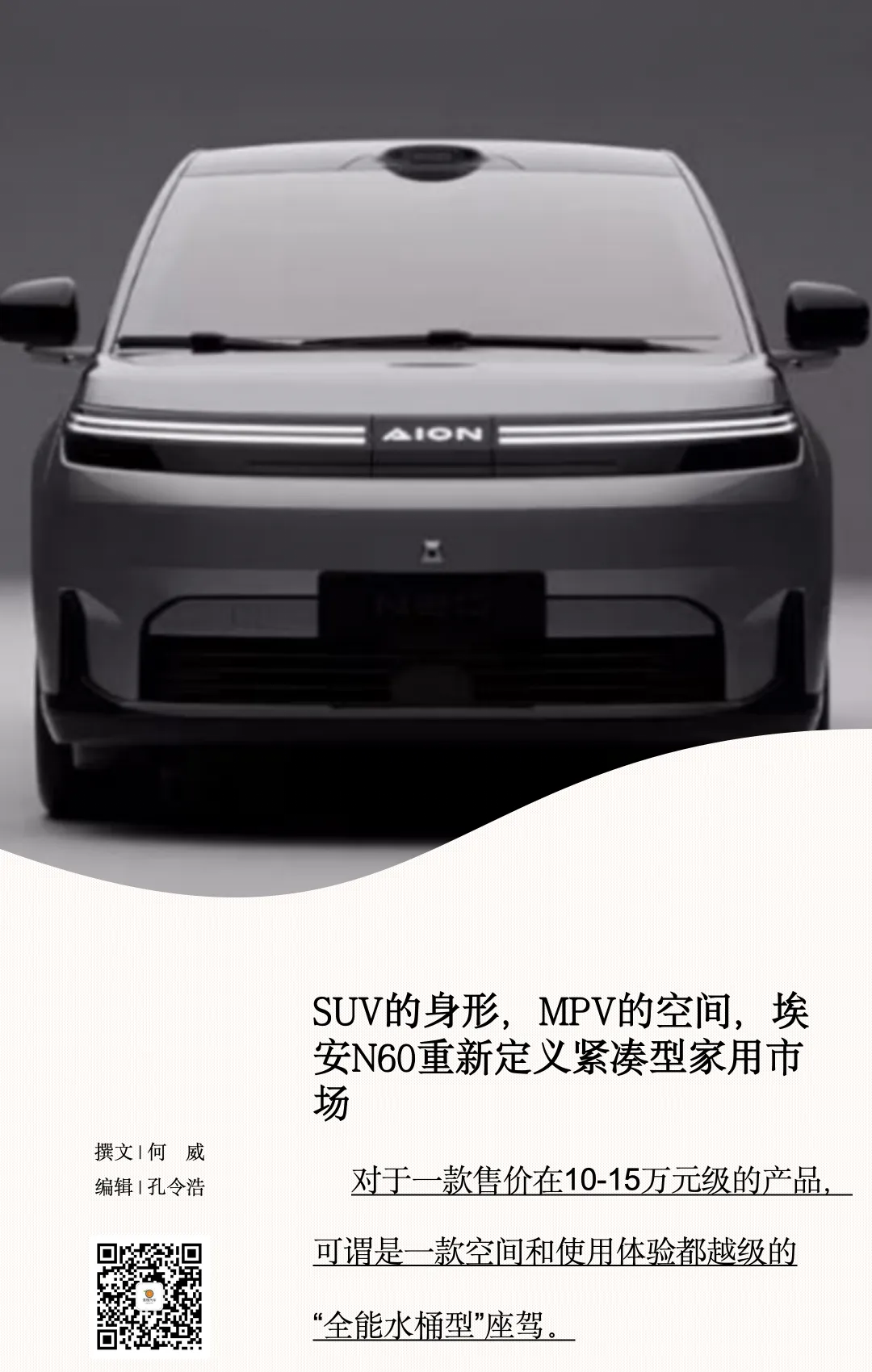 点评:对于一款售价在10-15万元级的产品,可谓是一款空间和使用体验都越级的“全能水桶型”座驾。相比给出标准答案的传统造型SUV,采用跨界设计,将MPV和SUV元素相结合的埃安N60通过独特的车身形态与空间优化,更精准的适配了家庭用户对于紧凑型车对乘坐体验与功能多样性的注重。N60的推出,将有望成为广汽埃安发掘家用细分市场的一款标志性产品。