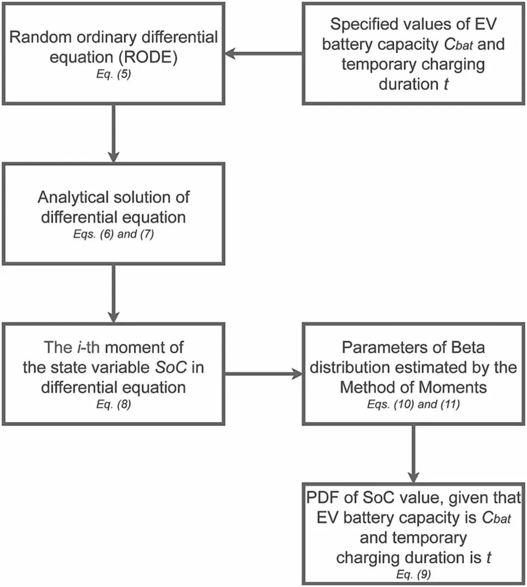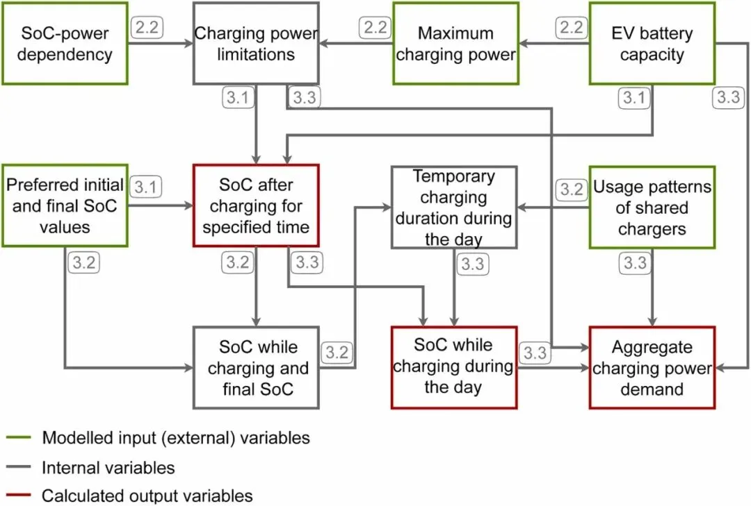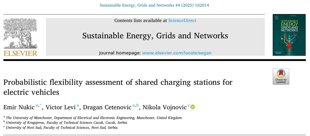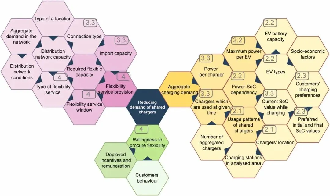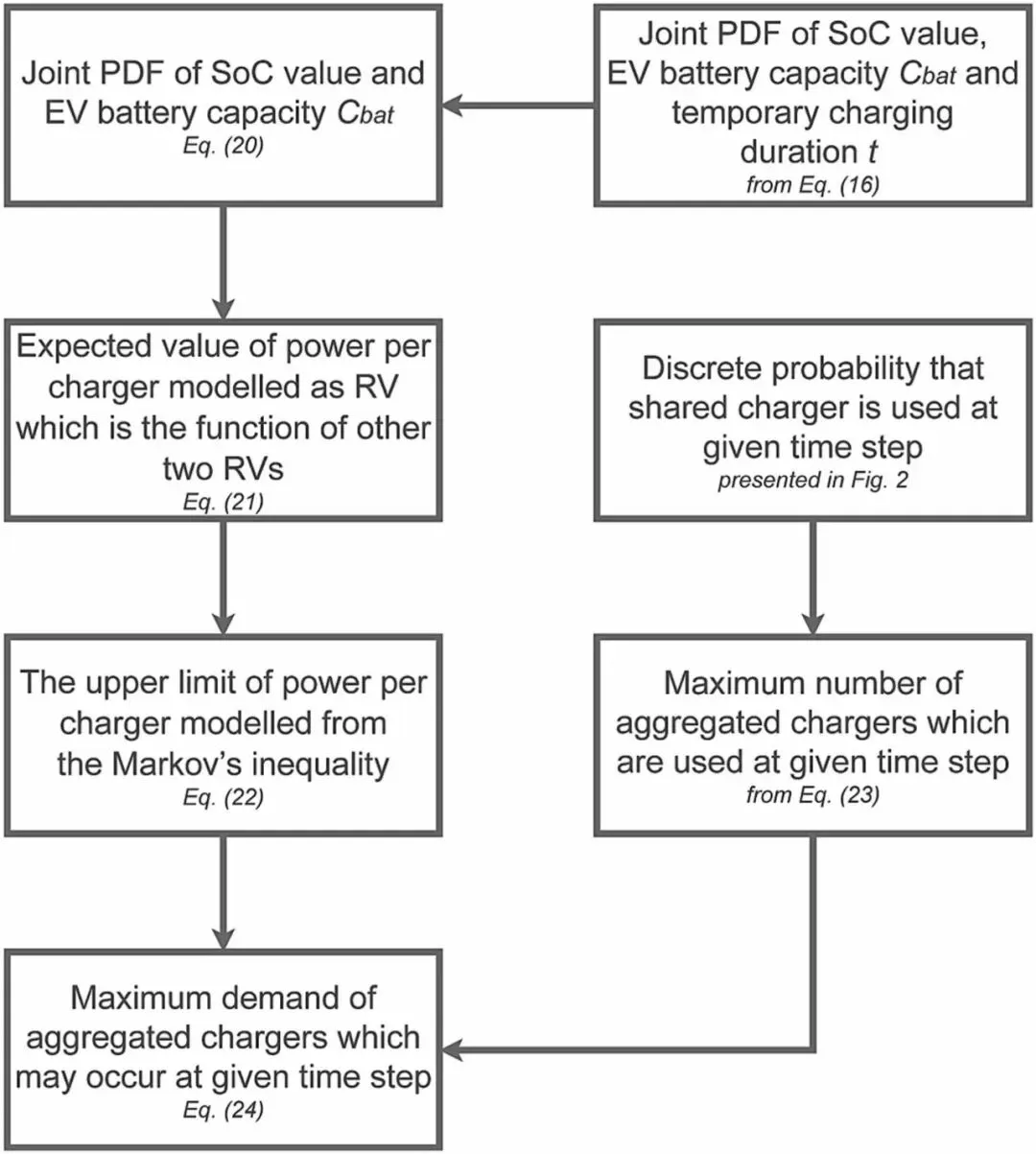 This paper proposes a probabilistic model for the flexibility assessment of shared charging stations for electric vehicles. Flexibility is modelled and evaluated in terms of the potential to reduce demand during the specified flexibility service window. Model is developed within the probabilistic framework to ensure that the randomness in modelled quantities is addressed. Main factors, which affect demand and available flexibility of charging stations, are identified and modelled in terms of the usage patterns of shared chargers, EV charging characteristics and customers’ charging preferences. Based on the proposed links between input, internal and output quantities, probability distributions of SoC value while charging, temporary charging duration at specified time, as well as the maximum aggregate charging power are calculated and presented. Finally, limits of available flexibility [kW] are quantified from the developed model for distinctive combinations of charging power rating, chargers’ location and flexibility service window. Flexible capacity is modelled and evaluated in line with the standardised active power services in the markets. Developed model is expected to be of particular interest in the distribution network planning.