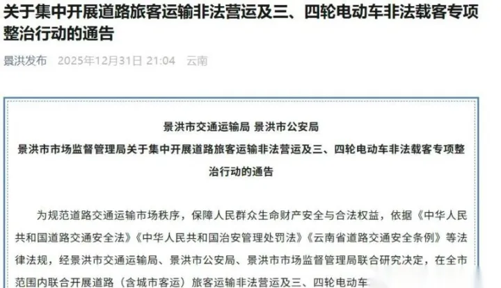 起初我也以为,这不过是每年春节前后的常规动作,查查酒驾、查查非法载客,做做样子。但这次我判断错了。当我看到吉林德惠直接通告“全市禁止非标车上路”,云南景洪搞了个为期半年的“专项整治”,甚至连市场监管局都下场了,我才明白,这套做法的思路变了。