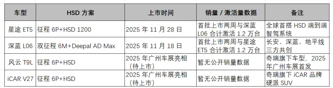 地平线HSD(HorizonSuperDrive)目前已搭载于星途ET5、深蓝L06、风云T9L、iCARV27等车型,以下为已公开的车型及销量数据: