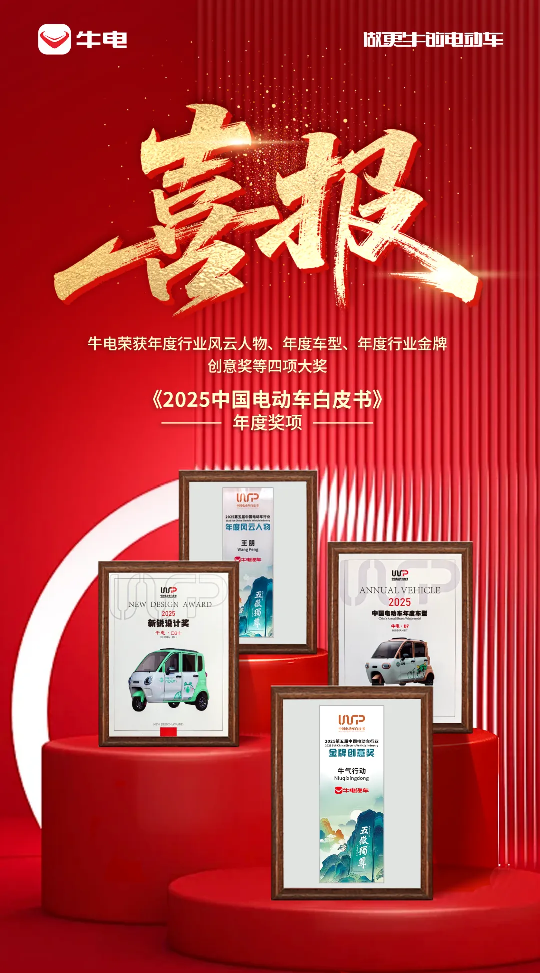 1月23日,由中国电动车产业发展研究会主办的《2025中国电动车白皮书》颁奖盛典在泰安举行。其中,牛电一举斩获年度行业风云人物、年度车型、年度行业金牌创意奖等四项大奖。这些奖项获得凸显了牛电品牌在电动篷车领域的强大产品创新实力和品牌实力。