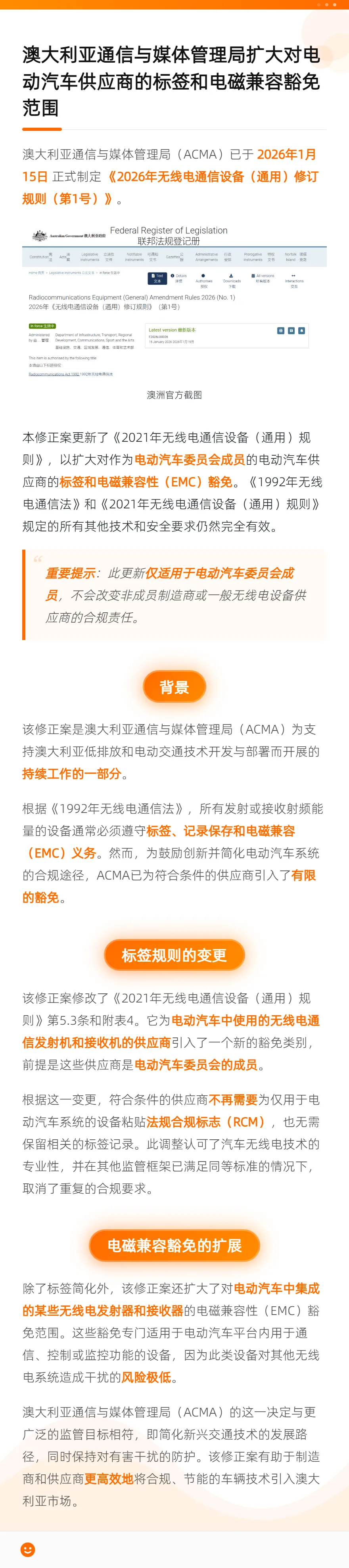 >澳大利亚通信与媒体管理局扩大对电动汽车供应商的标签和电磁兼容豁免范围