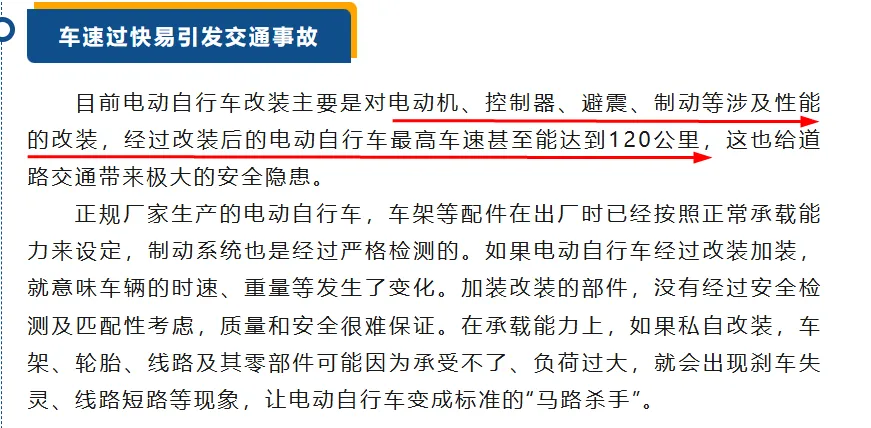 电动车上路,涉及到核心动力部件以及限速装置的改装,都会受到严厉的整治。近几年,电动车改装已经形成了常态化治理趋势,时不时都有专项行动。源头上禁止厂家生产非标电动车,同时禁止商家对合格电动车进行改装销售,这是当前的管理趋势。另外在终端消费者这一块,交警严查各种改装上路的电动车,特别是“2电一控”,成了重点整治对象。
