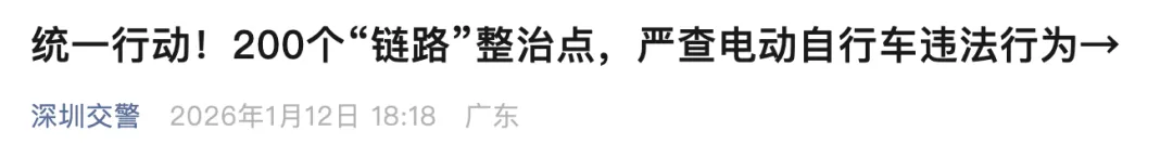 广东省从2026年1月起启动全年摩电专项整治,覆盖电动自行车、摩托车、三轮车,其中深圳作为重点城市,已设置200个整治点位,覆盖深南、北环等主干道,还启用无人机巡查违规行为。