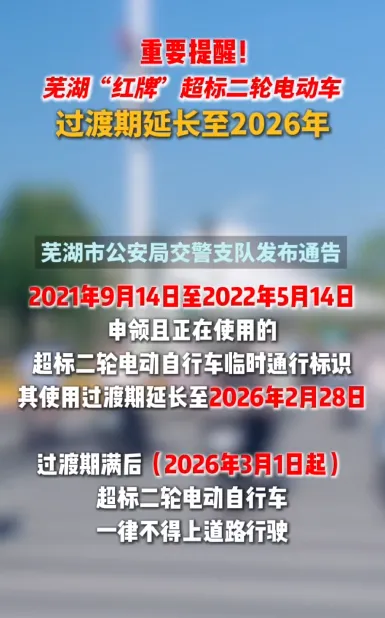 芜湖市红底白字临时通行标识的超标二轮电动自行车,过渡期延长至2026年2月28日,期满后一律禁止上路。