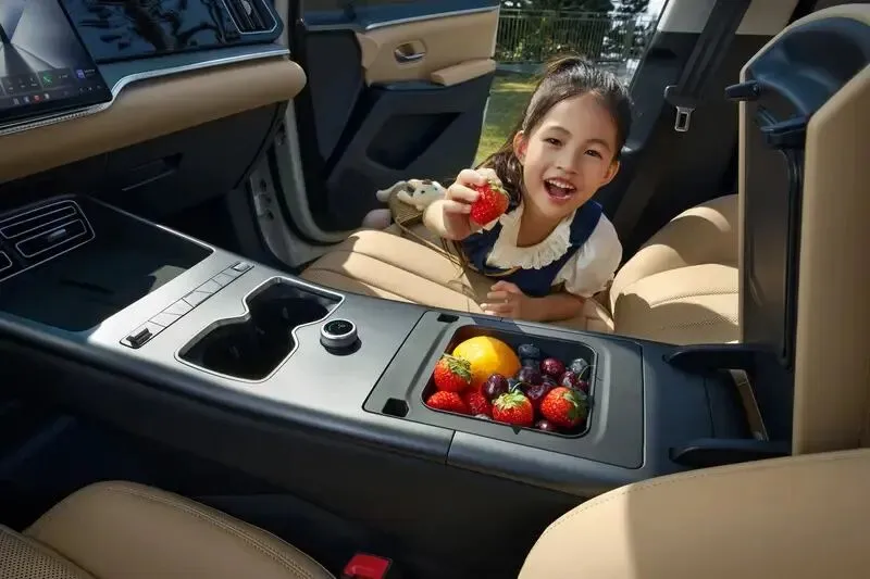 光跑得远、花得少还不够,坐得舒服才行。这次升级,它把配置也拉满了。同级最大的15.6英寸中控屏、前排座椅通风加热都安排上了,最让我小舅子媳妇喜欢的是那个一体式冷暖冰箱,夏天冰饮料,冬天温奶茶,带孩子出门特别实用。安全方面也没含糊,高强度车身、6个气囊,还有高速爆胎稳行系统,给全家出行又加了道保险。