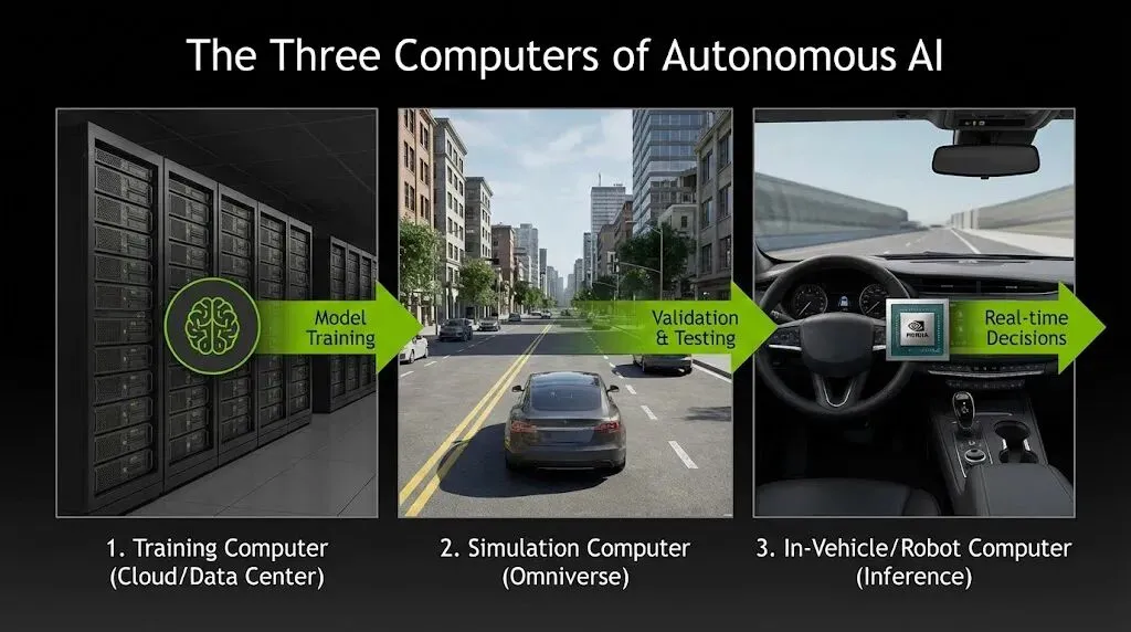 2. **仿真计算机 (Simulation)**:基于 Omniverse 的数字孪生世界,让 AI 在虚拟世界里先跑个上亿公里,确保安全。