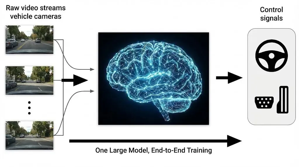 **端到端大模型(One Large Model)**:不再是拼凑的代码,而是像人类大脑一样,输入视频,直接输出驾驶控制。