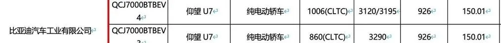 前两天工信部.第402批公告一出来,我第一.时间就扒了个底.朝天。不得不承认,比亚迪这波操.作,确实让我这个老车评.人也有点激动了——仰望U7直接上了150度的超大电池,纯电续航1.006公里,配上兆瓦闪充,15分钟左右就能充满。