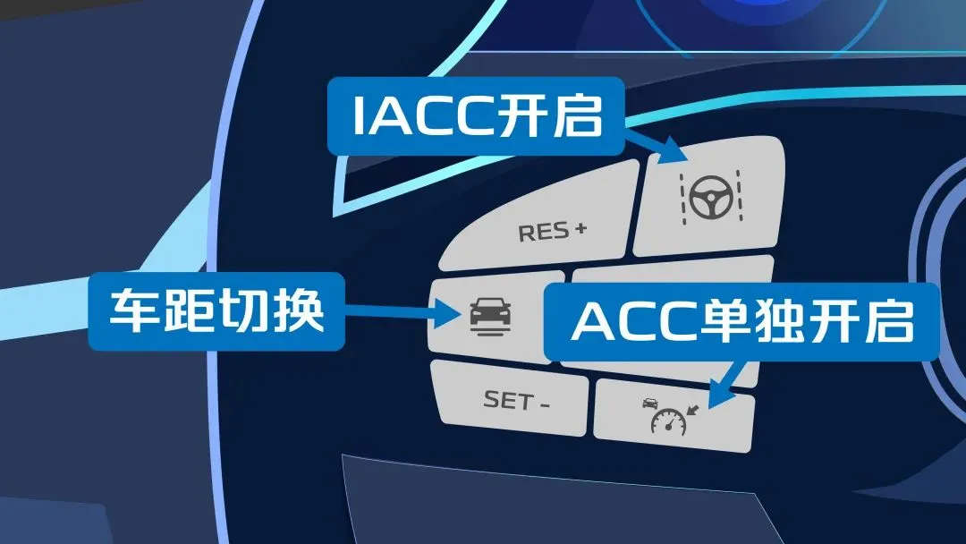在路况良好的快速道路行驶时,点击方向盘左上角的按键,即可开启IACC。开启后,车主即可通过RES+与SET-设置初始巡航速度,享受舒适出行啦~