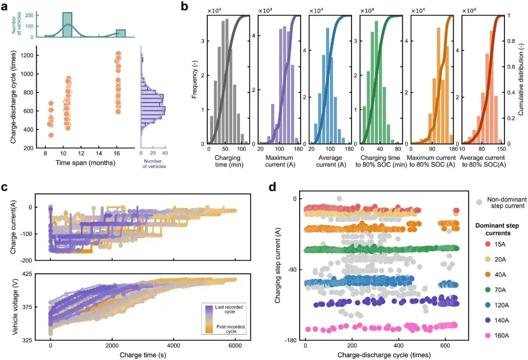 基于大规模真实车辆运行数据,本文系统刻画了快充电动汽车电池容量衰减的复杂特征空间。研究共采集了来自300辆纯电动出租车的193,180条充放电样本,这些车辆搭载由96串NCM电芯组成的动力电池系统,BMS以10 s采样间隔持续记录电流、电压、SOC和温度等关键信息。数据按投运时间划分为三批次(图1a),覆盖了从数百到千余次循环、不同里程水平和容量衰减状态,充分反映了车辆使用强度和充电行为的高度多样性。统计分析表明,车辆普遍采用多阶段恒流快充策略,最大充电电流可达180 A,超过一半的充电过程在40 min内完成,且约60%的样本可在30 min内充至80% SOC(图1b),凸显了典型快充工况特征。进一步分析单车充电曲线发现,充电初始与结束SOC高度随机,同一车辆在不同循环中的电流阶段和幅值亦存在明显差异(图1c、d),反映出真实应用中由不同充电桩和初始状态引入的随机性。针对这种多阶段、高倍率且不稳定的充电行为,研究结果表明,将用户充电行为信息与特征工程相结合,并在特征构建中全面纳入电池包内各单体电压和温度演化特征,有助于有效表征复杂使用条件下的容量衰减规律,为快充电动汽车电池SOH估计提供了坚实的数据基础和方法支撑。