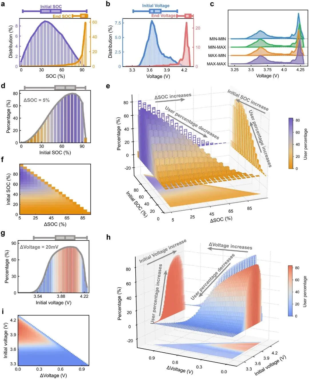 本文提出了一种融合锂离子电池机理认知的特征工程方法,用于构建具有跨车辆、跨工况适应性的车载电池老化检测模型。通过对大规模真实工况下用户充电行为进行统计分析,研究从SOC与电压两个维度刻画了电池包及单体电芯的动态特征,以确定对驾驶和充电策略不敏感的特征提取窗口。结果显示,约55%的充电行为始于40%SOC以上,而超过96%的充电过程终止于80%–100%SOC,其中59%为满充(图2a),反映出明显的里程焦虑特征。在电压层面,通过比较MAX–MAX、MAX–MIN、MIN–MAX和MIN–MIN四种初末电压组合,发现各方案下的分布高度一致(图2b、c),表明电池包整体均衡性良好,因此后续分析聚焦于MAX–MAX方案。进一步分析用户在不同SOC区间内的充电比例发现,用户占比随初始SOC升高而增加,但随ΔSOC增大而降低,说明高SOC下频繁、小幅补电的行为占主导(图 2d–f)。类似的非均匀性也体现在电压分布中,20 mV电压窗口下的充电概率密度从3.70 V时的54.1%逐步上升至4.2 V时的83.6%,而过宽的电压窗口则显著降低了有效样本比例(图2g–i)。这些结果揭示了样本数量与窗口宽度之间的权衡关系。基于此,研究提出按评估频率定制SOC或电压数据窗口的策略,例如在较高频率下采用较窄窗口、在较低频率下拓宽窗口,以在保证样本充分性的同时降低驾驶与充电行为异质性影响,从而提升电池老化建模在不同使用场景下的灵活性与泛化能力。