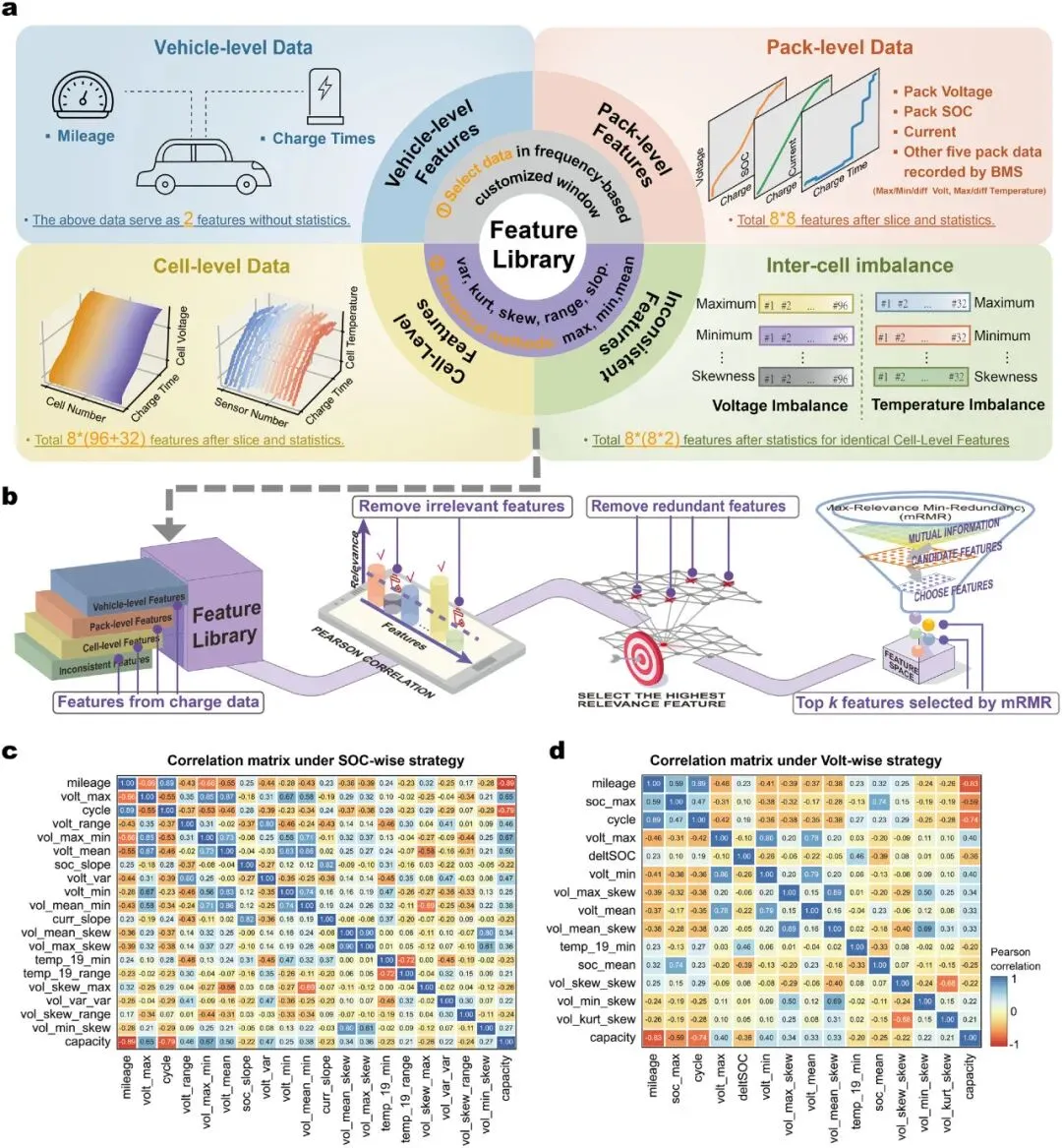 针对电池老化对制造差异、成组方式、循环工况及温度条件的高度敏感性,本文提出了一套面向整车应用的、全方位特征工程框架,以支撑跨车辆、跨电池包和跨工况的通用老化建模。基于定制的数据窗口(图3a),研究结合电压、电流、温度和SOC等BMS信号,在车辆、整包和单体三个层级系统性构建特征,通过线性与非线性变换刻画电池在运行过程中的电化学演化特征。其中,车辆层级仅包含里程和充电次数,而在整包和单体层级内,于特定SOC或电压窗口(如 f=1/2对应55%–90%SOC或3.78–4.18V)提取最大值、最小值、均值、方差、偏度、峰度、极差和斜率等统计量,最终形成64个整包特征、1024个单体特征,并进一步通过跨单体的二次统计构建128个不一致性特征,用于量化在均衡策略下仍然存在的内部差异。随后,通过系统化的特征筛选流程(图 3b),在SOC-wise与Volt-wise两种策略下分别保留了19个和14个关键特征,其相关性结构如图3c、d所示。结果表明,SOC-wise策略保留的有效特征更多,可能与BMS中SOC不确定性较高、需依赖更多老化相关信息有关;同时,两种策略之间仍存在显著重叠,识别出一组稳定且具有物理意义的核心特征。进一步分析发现,里程、充电次数和整包最大电压在两种策略下均位居特征重要性前列,单体层级的分布特征(尤其是偏度)相比传统方差更敏感地反映了均衡条件下的老化差异,而温度相关特征同样发挥关键作用,印证了温度对电池衰退的主导影响。在此基础上,筛选后的特征被输入SVR、RF和MLP等机器学习模型,对车辆运行中的SOH进行估计,其中容量通过SOC窗口内的安时积分确定。结果表明,该特征工程体系在保证物理可解释性的同时,兼顾了模型精度与工程可部署性,为真实车辆中电池健康状态的在线评估提供了可靠支撑。