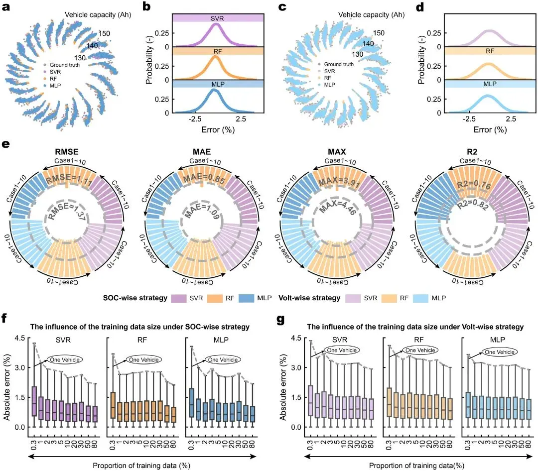 本文系统评估了所提出SOH估计框架在跨车辆场景下的性能,分别结合SOC-wise与Volt-wise两种策略,并采用SVR、RF和MLP三类机器学习模型进行验证。模型仅基于训练集中的退化特征进行训练,未引入待验证车辆的历史使用信息,从而对特征泛化能力提出了更高要求。在频率为 f = 1/2 的定制化评估框架下,选取第一批次中63辆车(约占数据集30%)作为训练数据,其余批次车辆用于独立验证模型在不同车辆批次间的迁移性。结果表明,在SOC-wise策略下,三种模型均能准确跟踪重度与中度老化车辆的容量衰减趋势,估计结果及误差分布如图4a和b 所示,大多数样本的绝对误差低于2.5%,RMSE和MAE分别控制在1.2%和0.92%以内,最大误差不超过4.2%,显示出良好的跨批次一致性和鲁棒性。Volt-wise策略虽整体误差略高(图4c和d),但仍保持RMSE约1.41%、MAE约1.12%、最大误差约4.7%,从侧面印证了框架的有效性。进一步通过多组随机车辆组合实验(图4e),在不同训练集划分和算法条件下,SOC-wise策略始终保持RMSE约1.05%–1.18%、MAE约0.80%–0.91%,Volt-wise策略也稳定在RMSE约1.3%–1.41%的水平,说明该框架无需针对特定用户行为或运行工况进行筛选,即可在多车辆间实现可靠泛化。对比分析还发现,传统模型(SVR、RF)与神经网络模型(MLP)在性能上并无显著差异,且与LSTM、GRU等方法的对比结果进一步表明,SOH估计精度主要受特征有效性驱动,而非模型复杂度。最后,通过逐步缩减训练数据规模(图 4f和g),研究发现即便仅使用单车数据训练,模型仍可获得可接受的估计精度(SOC-wise下RMSE约1.82%),而5%的训练数据已足以在精度与效率之间取得良好平衡。这一结果凸显了该基于频率定制特征工程的框架在工程应用中的现实潜力,为将轻量级ML模型直接集成至BMS、实现实时SOH在线监测提供了坚实依据。