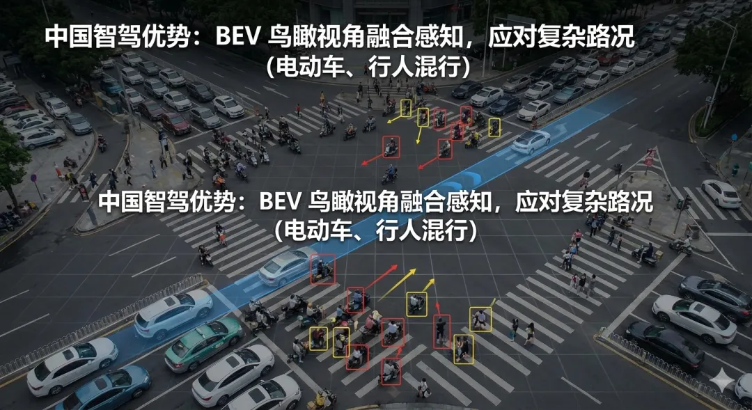 零干预驾驶成现实:X上有人从美国东海岸到西海岸(约5000公里)100%自动,零接管、零干预。还有用户开车2万公里零干预,直到车陷雪地(非安全接管,只是物理卡住)。奥斯汀Robotaxi正式上线(2026.1.22):Tesla在美国奥斯汀面向公众推出无安全员出租车!乘客用App叫车,车自己来、自己开。目前的特斯拉 FSD 已经有了“推理能力”(Reasoning Capability),AI像人类“思考”决策而非死规则。Tesla AI负责人Ashok说V14版本已有体现,V14.3会更强,马斯克称“解决拼图最后一块”。传统AI像机器人走直线,推理AI像侦探,分析“为什么这个车道堵?换道值不值?”例子:红灯时,AI不傻等,还预测“绿灯几秒亮”,优化路线。安全数据超人类:Tesla报告显示,FSD每百万英里事故率仅0.1(人类平均1.0)。美国已有保险公司给FSD车主半价保险!特斯拉使用“影子模式”(Shadow Mode),免费使用车主的驾驶方法,还有无数的自媒体博主上传的接管或者不合理的驾驶行为,AI在后台模拟人类驾驶,学习错误而不干预。像学生在老师后面“偷师”,记下“哦,这里容易出错,下次避开”。备注:这是另一家AI 生成的图片,大家认为怎么样?3. 中国智驾追赶之路:本土优势 vs 全球差距