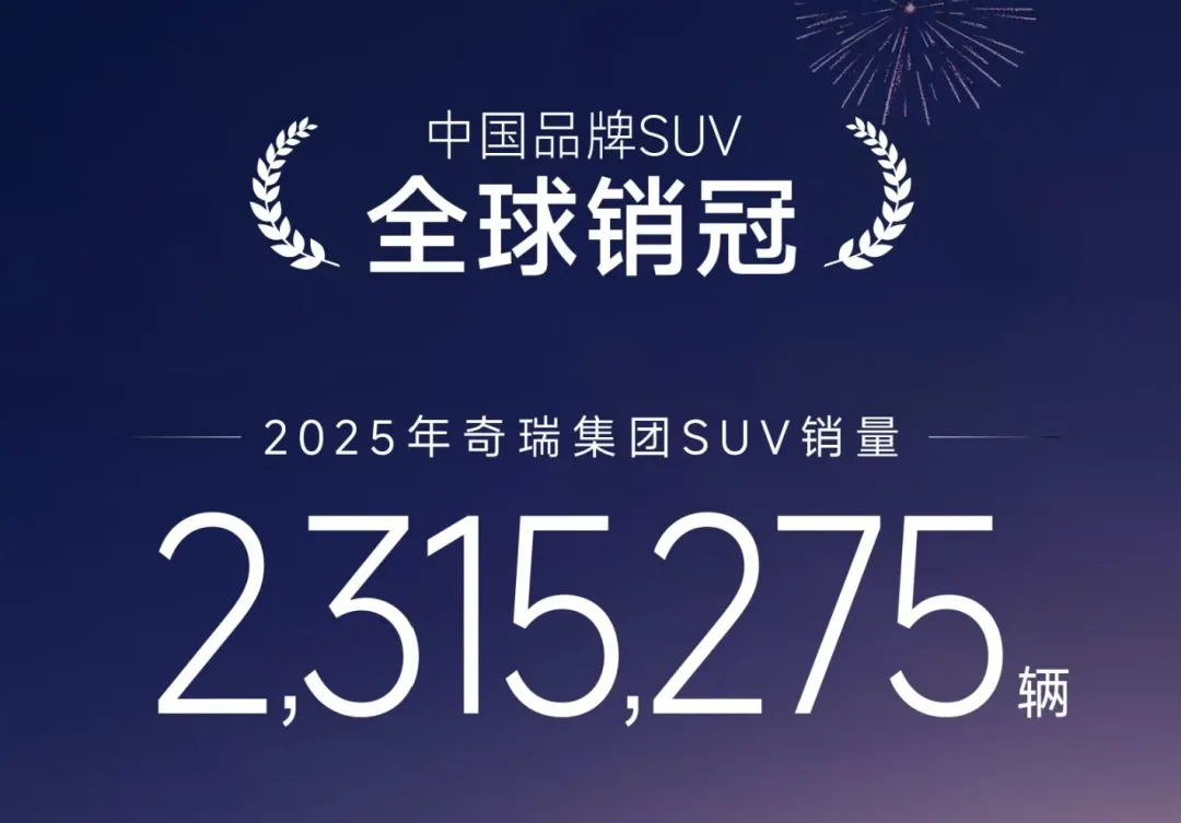 电动知家消息,1月24日,奇瑞集团正式公布2025年销量成绩单,全年SUV车型全球销量突破231万辆,成功斩获中国品牌SUV全球销量桂冠,同时以全年出口超134万辆的成绩,连续23年位居中国品牌乘用车出口榜首,彰显中国汽车品牌在全球市场的硬实力。