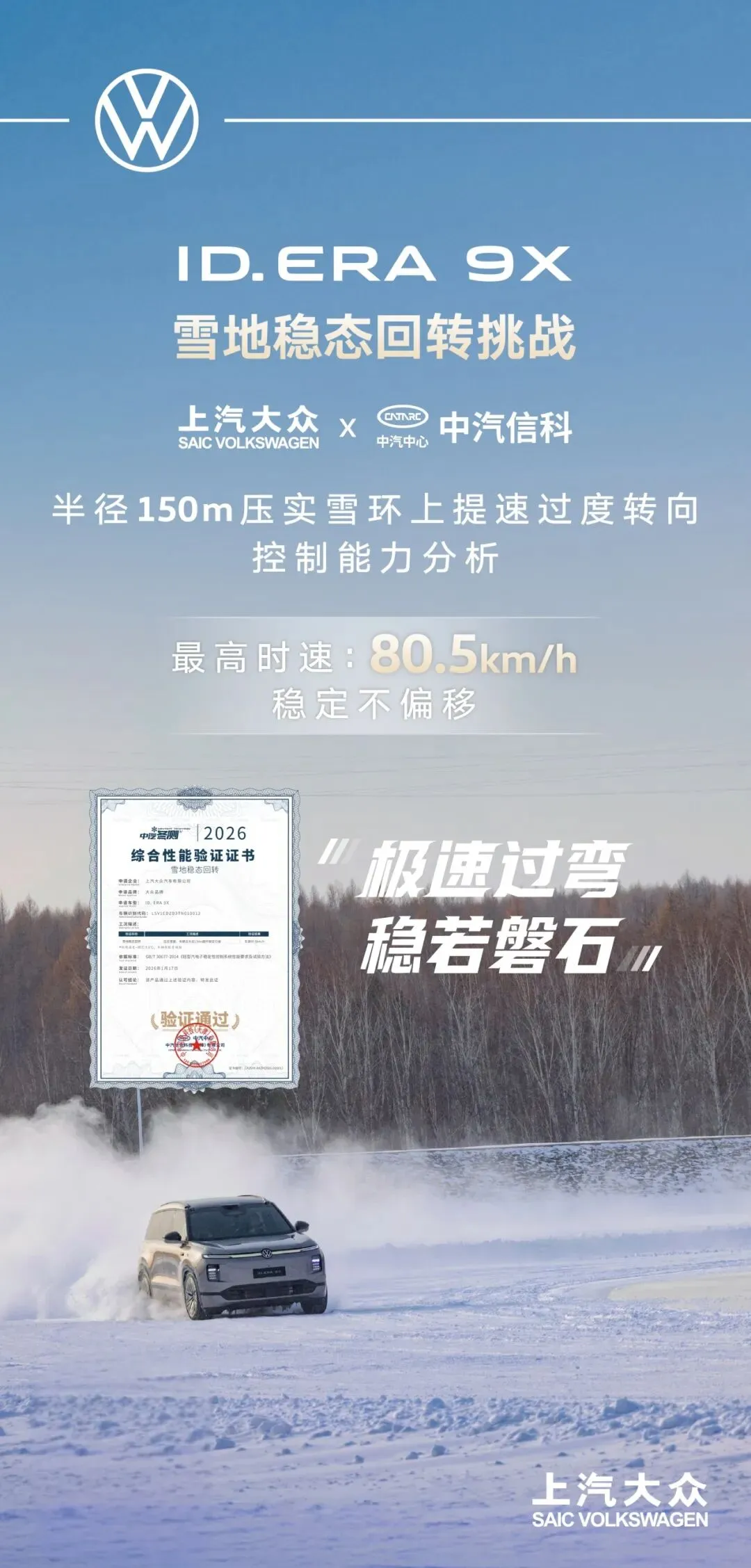 在极致操控挑战“雪地稳态定圆”测试中,上汽大众ID. ERA 9X于压实雪面以80.5km/h的时速精准完成半径150米的圆周稳定行驶,全程无偏移。这项测试,不仅要求车辆在极限状态下保持动力持续性、转向手感与底盘平衡的精密协同,更严苛考验系统在过度转向工况下的容错与控制精度。ID. ERA 9X凭借行业领先的德系底盘调校与毫秒级响应的底盘悬架系统,展现出超强的动态稳定性,这意味着用户在湿滑弯道或紧急变线等真实复杂路况中,能获得更从容、更安全的驾驶信心。