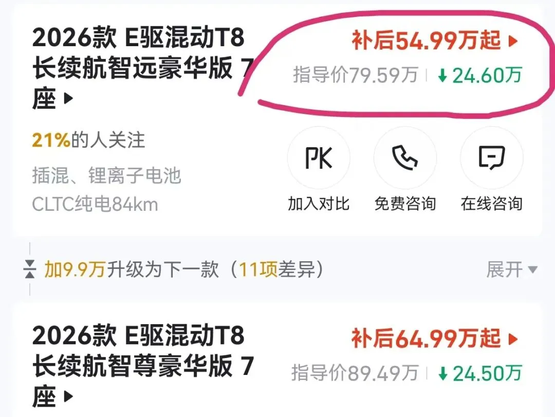 到现在沃尔沃XC90 PHEV有两个版本,其中2026款E驱混动T8智远豪华版7座,降低了24.6万,54.99万;2026款E驱混动T8智尊豪华版7座降低了24.5万,64.99万。