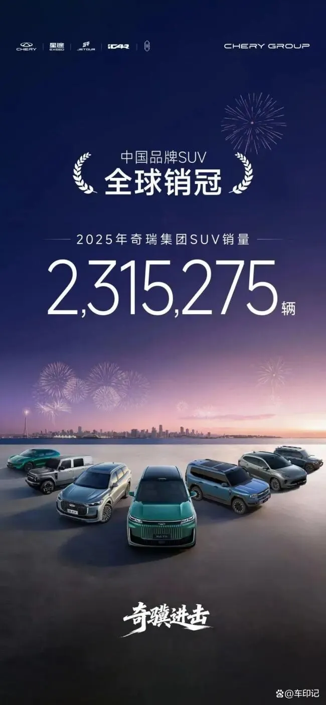 当2025年全球汽车市场的硝烟散去,一份亮眼成绩单定格中国品牌的高光时刻:奇瑞集团以231万辆的全年SUV全球销量,首次斩获中国品牌SUV全球销冠,同时以超134万辆的年出口量,连续23年稳居中国品牌乘用车出口榜首,累计出口突破585万辆,成为首个迈过500万辆出口门槛的中国品牌 。每5辆驶向全球的中国汽车中就有1辆“奇瑞造”,这场跨越百国的胜利,见证着中国汽车从“中国制造”到“中国智造”的质变。