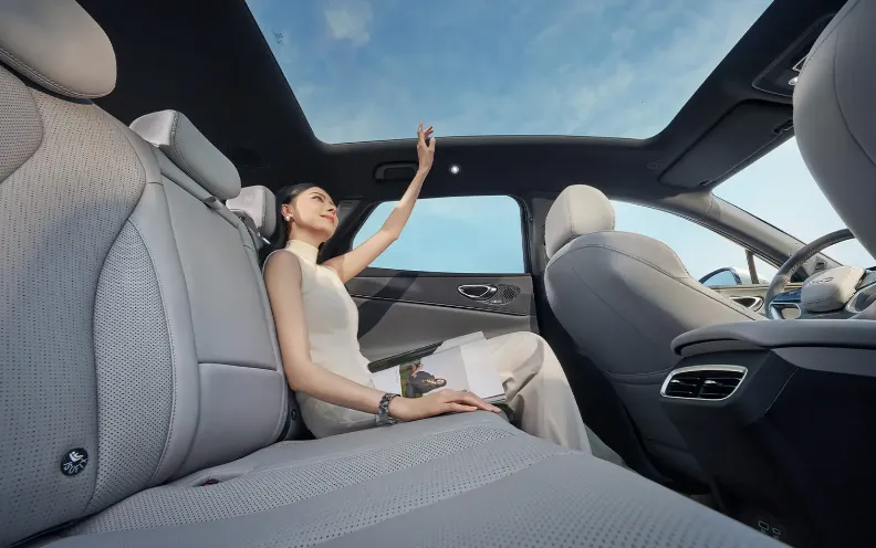 动力上纯电版搭载碳化硅三合一电驱总成,峰值功率220kW,零百加速5.9秒,起步轻盈平顺,没有电动车常见的窜动感,满载5人加行李,高速超车也不费劲。最让人安心的是120km/h爆胎稳定控制,爆胎后500ms内就能通过制动、转向融合控制稳住车身。